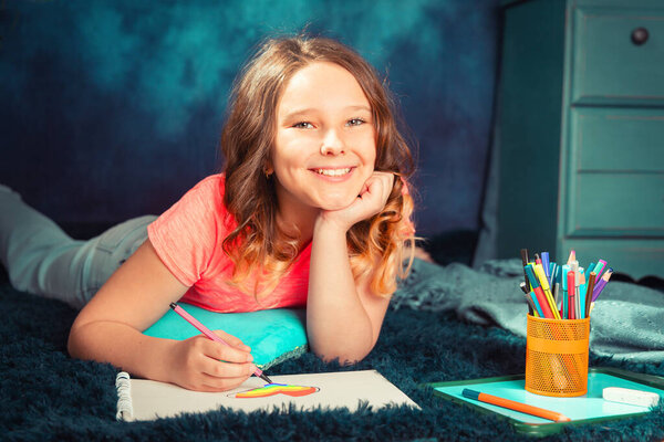 732071928 Happy teenage girl drawing rainbow heart symbol laying on her stomach, positive and smiling emotions, education theme