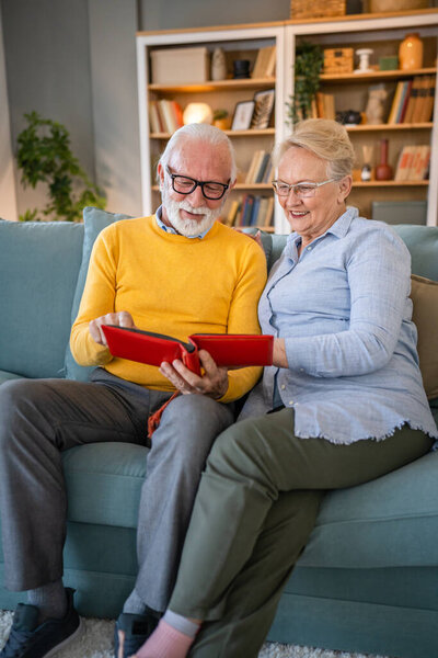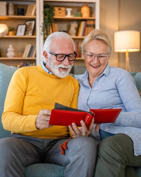 688549148 Senior couple man and woman husband wife looking family photos album caucasian old male and female grandfather and grandmother happy smile at home with old pictures real people copy space