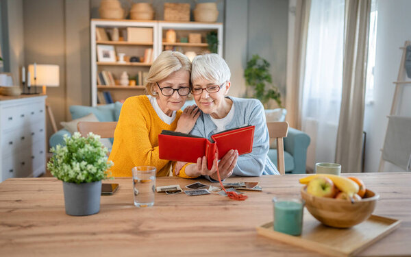 656530296 Senior mature women friends or sisters looking family photos album two caucasian females sit at home happy smile while revoke memories real people copy space