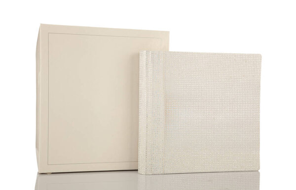 817990510 Stylish wedding photo album and its box standing up on a reflective white surface, creating a luxurious and elegant presentation for preserving cherished memories