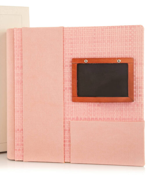 817990688 Elegant pink photo album with a small wooden frame on the cover, ready to be personalized with a title or a dedication, evoking cherished memories and special moments