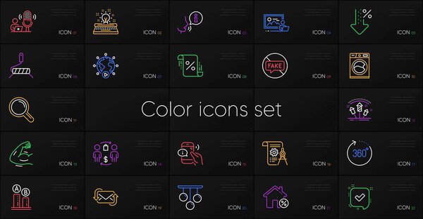 656229126 Set of Typewriter, Fake news and Low percent line icons. Include Strong arm, Ceiling lamp, Video conference icons. Research, Loan house, Refresh mail web elements. Confirmed. Vector