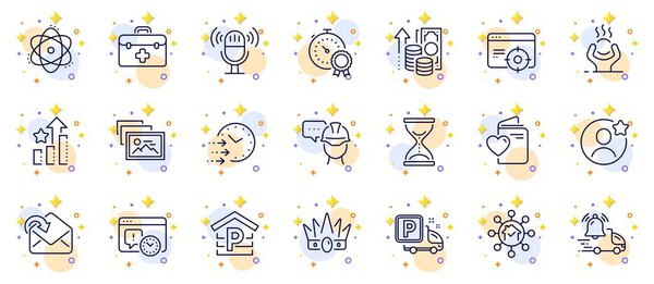 676701200 Outline set of First aid, Delivery time and Time hourglass line icons for web app. Include Seo targeting, Difficult stress, Foreman pictogram icons. Receive mail, Best friend. Vector