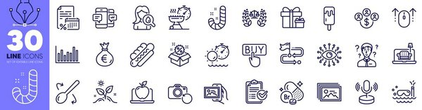 680020816 Bromine mineral, Grow plant and Furniture line icons pack. Grill time, Bar diagram, Ice cream web icon. Justice scales, Laptop, Moisturizing cream pictogram. Candy, Sale, Buying currency. Vector