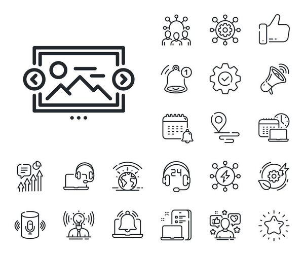 691485824 Photo thumbnail sign. Place location, technology and smart speaker outline icons. Image carousel line icon. Album picture placeholder symbol. Image carousel line sign. Vector
