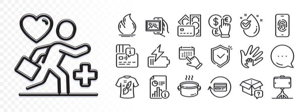 662888182 Image album, Secret package and Card line icons set for app include Fire energy, Fingerprint, Saucepan outline thin icon. T-shirt design, Event click, Selfie stick pictogram icon. Shield. Vector