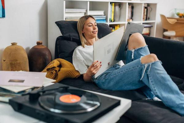 660260092 A pretty woman listening to music on gramophone and looking at t the covers of her records.