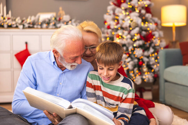 768904428 Grandparents showing old photo album to grandson while spending Christmas day together at home; grandfather reading a book to grandson during winter holiday season