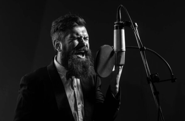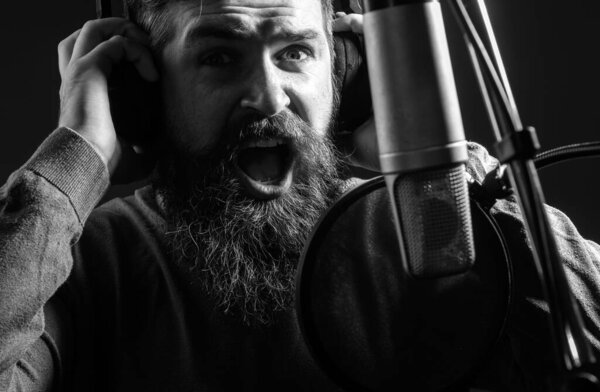 713726292 Singer singing rock. Sound producer recording song in a music studio. Excited Karaoke