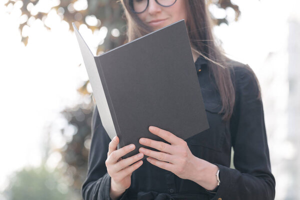 664437862 Black book cover in woman's hands. Book cover for mock up