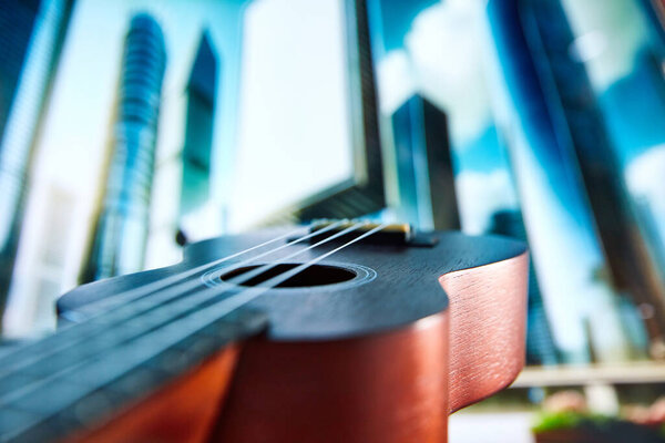 698709132 Close-up, focus on guitar with blurred cityscape background. Marketing for urban music events and city festivals. Concept of music instruments, performance, hobby, art, entertainment