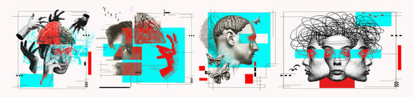 728444842 Contemporary art collage. Art for mental health clinics, illustrating complexity of human mind and emotions through abstract visual. Concept of psychology, mental health. health care, awareness