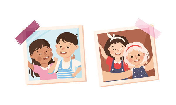 749785936 Photo Card or Snapshot with Happy Smiling Children Sticking on the Wall Vector Set. Excited Kids on Self-portrait Photograph Square Shot Concept