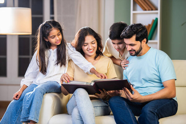 744664302 Indian asian young family of four enjoying quality time on sofa at home, parents, kids relaxing, reading stories, and looking through photo albums together, capturing joyful family bonding moments