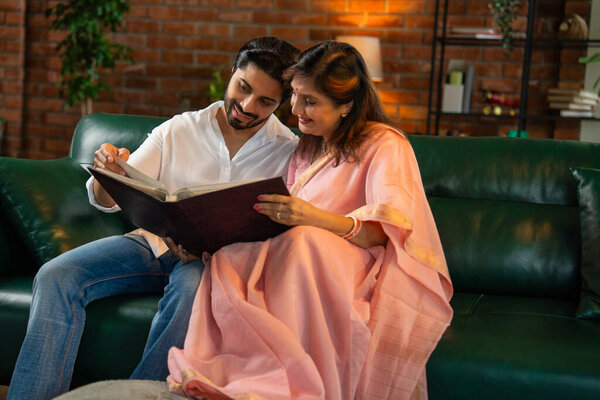752291386 Elderly Indian mother in her sixties, her young son joyfully looking at a photo album or frame, reminiscing about happy memories while sitting on a sofa in living room with warm, moody lighting