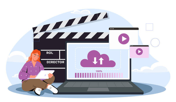 737528102 Woman uploading video. Young girl near laptop uploads video to cloud service. Production of entertainment content for social networks and video hostings. Flat vector illustration