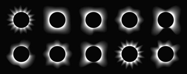 738538448 Big set of circle illuminate frames with gradient. Ten white round neon banners isolated on black background. Vector illustration