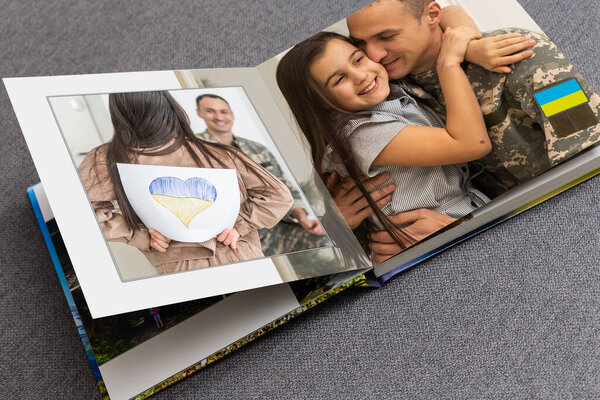 618640320 Family photos archive saved in brightly designed photo book bright summer memories placed in the photobook. family with flag of ukraine"