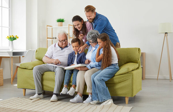 835797516 Friendly happy smiling big family with parents, kids, grandparents looking at family photo album together sitting in modern light living room at home. Emotional family moments, togetherness concept.