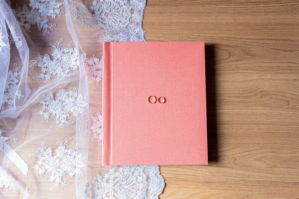 678226490 Pink photo album with wedding rings on white cloth and wooden table