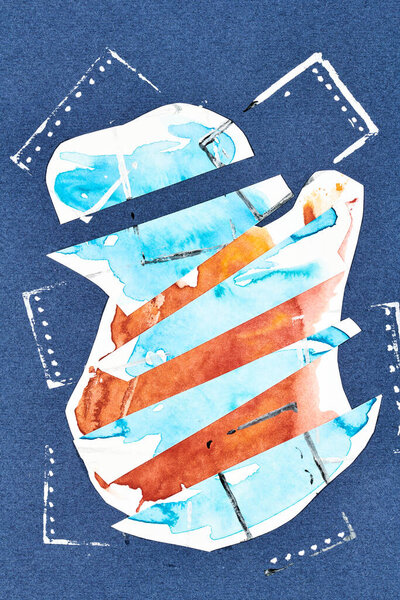 675663462 Abstract background, multicolor art collage. Creative pattern design for print invitation card, postcard. Drawing poster, colorful wallpaper. Blue, white, brown colors