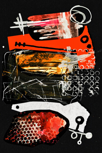 680406274 Abstract background, multicolor art collage. Creative pattern design for print invitation card, postcard. Drawing poster, colorful wallpaper. Black, red, white colors
