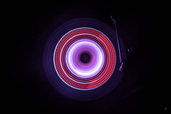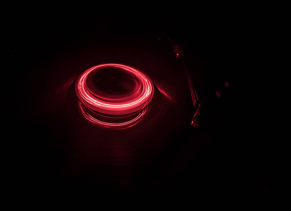 707485958 Music Dj concept. Trail of fire and smoke on vinyl record. Burning vinyl disk. Turntable vinyl record player on dark background. Selective focus