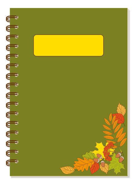 566843042 Colorful cover design with autumn foliage and rowanberry bunch for school notebook, exercise book, sketchbook, album, copybook. A5 size isolated notebook template with spiral and blank space. EPS 1