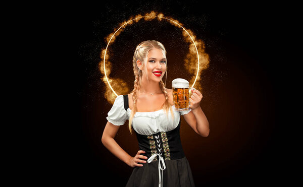 671637828 Half-length portrait of young sexy blonde with big breast wearing black dirndl with white blouse holding the beer mug Isolated on dark background