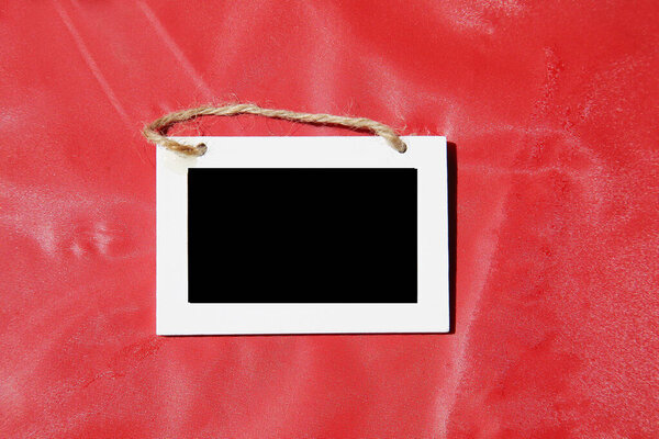 637466404 Blank photo frame on red background