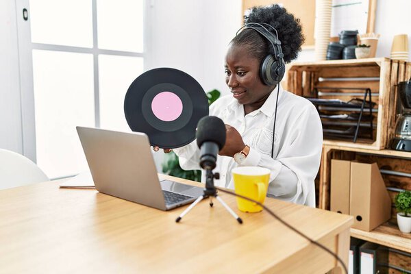 651729326 Young african american woman broadcaster smiling confident holding vinyl disc at radio studio
