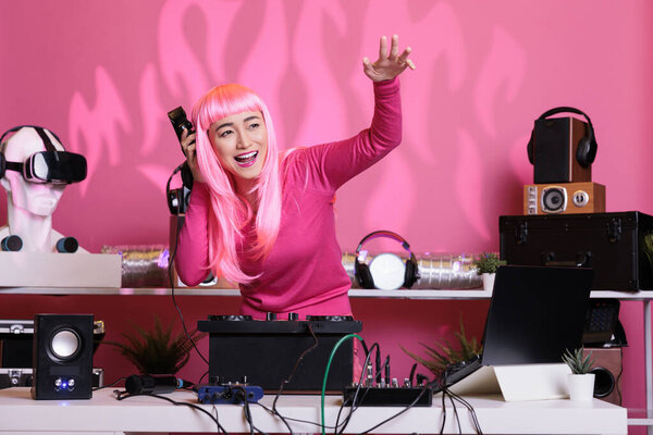 633296960 Artist with pink hair having fun while performing eletronic music in night club playing song using professional turntables. Woman standing at dj table dancing while celebrating album with fans