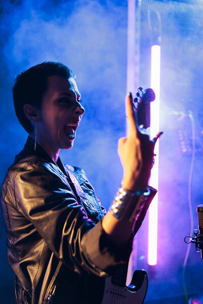 642074950 Woman superstar with short hair holding electric guitar playing rock music preparing heavy song to perform at grunge concert. Rockstar in leather jacket adjusting electricinstrument working at