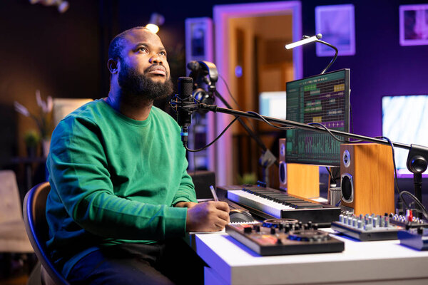 804016344 Musician singer thinking about new lyrics to fit into the new song chorus, writing melodic words and rhymes to create a tune in his home studio. Skilled composer making music for an album.