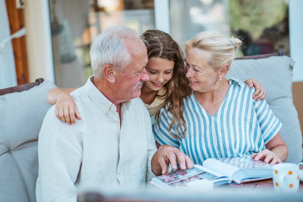842133518 Senior couple showing family photo album to granddaughter, enjoying old memories.