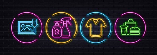 631639158 T-shirt, Cleaning liquids and Download photo minimal line icons. Neon laser 3d lights. Fast food icons. For web, application, printing. Short sleeves shirt, Antiseptic soap, Image placeholder. Vector