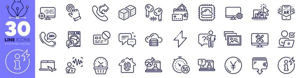 678757556 Money, Augmented reality and Card line icons pack. Voice wave, Seo, Wallet web icon. Washing machine, Online chemistry, Repair pictogram. Faq, Last minute, 24h service. Design with pen tool. Vector