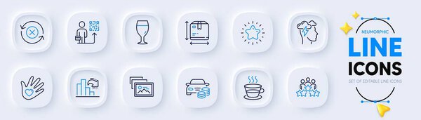 680939216 Buy car, Star and Coffee cup line icons for web app. Pack of Box size, Decreasing graph, Leadership pictogram icons. Beer glass, Photo album, Business meeting signs. Neumorphic buttons. Vector