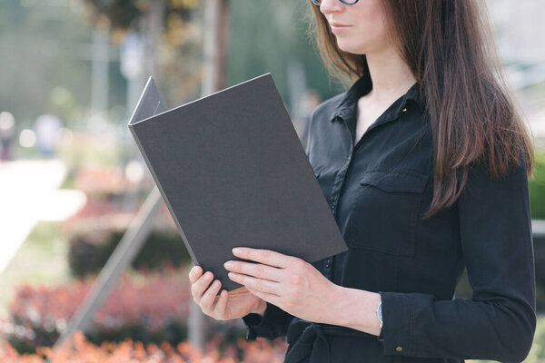 664437886 Black book cover in woman's hands. Book cover for mock up