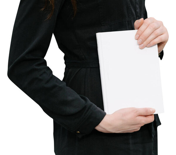 678585430 White book cover in woman's hands. Book cover for mock up isolated on white background