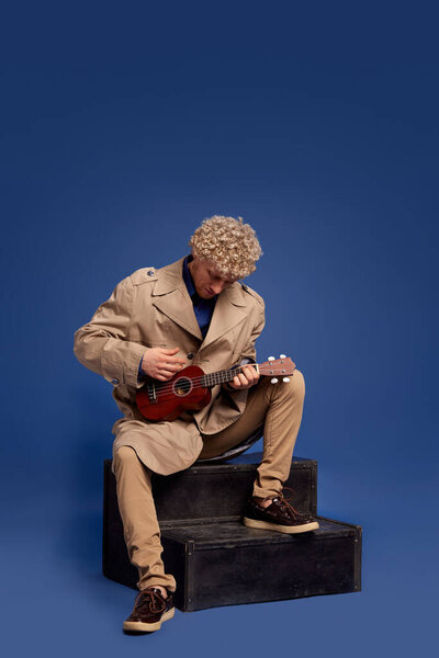 708210000 Stylish man in trench coat sitting and playing ukulele against dark blue background. Making performance. Concept of music, performance, art, entertainment, festival, performance, ad