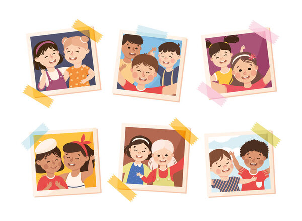 778948876 Photo Card or Snapshot with Happy Smiling Children Sticking on the Wall Vector Set. Excited Kids on Self-portrait Photograph Square Shot Concept