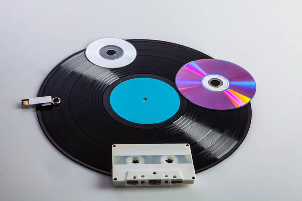 659796780 Vinyl record with other various digital media from different eras such as cassettes, dvds, pen-drives, isolated on a white background