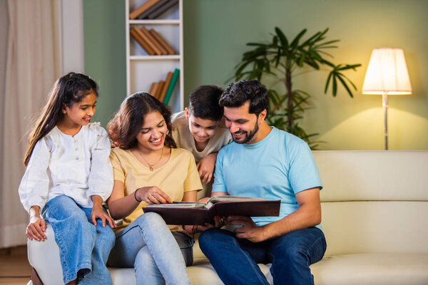744668514 Indian asian young family of four enjoying quality time on sofa at home, parents, kids relaxing, reading stories, and looking through photo albums together, capturing joyful family bonding moments