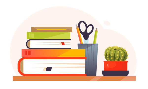 715768008 A bookshelf with books and writing materials. A stack of books on a shelf. Vector cartoon illustration.