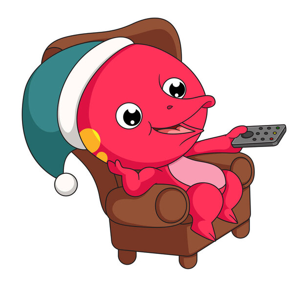 705926500 Cute little dinosaur cartoon sitting on armchair switching channels with remote of illustration