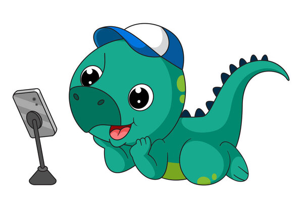 705926534 Cute little dinosaur cartoon taking selfie with phone of illustration
