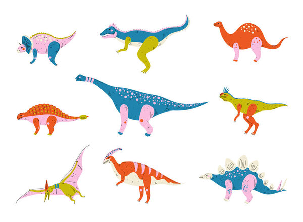 243353834 Collection of Colorful Dinosaurs, Brontosaurus, Tyrannosaurus, Ankylosaurus, Tsintaosaurus, Pterodactyl, Parasaurolophus, Stegosaurus, Carnotaurus Cute Prehistoric Animals Vector Illustration on White