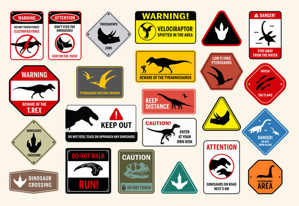 794704734 A set of vector warning signs featuring dinosaurs, including T.Rex, Velociraptor, Triceratops, Plesiosaur, Brachiosaur and Pterosaurs. Prehistoric-themed caution signs for safety, danger, and adventure park concepts.