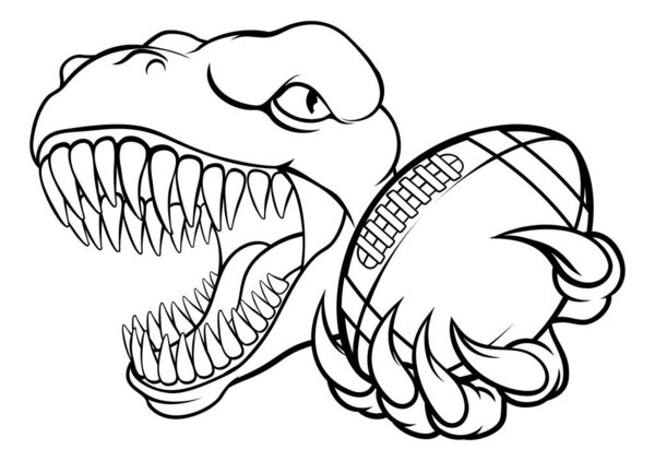 811996054 A dinosaur T Rex or raptor American Football player cartoon animal sports mascot holding a ball in its claw